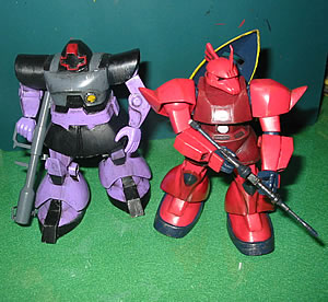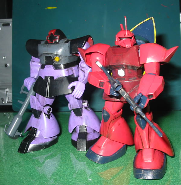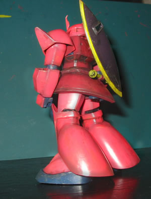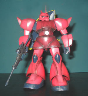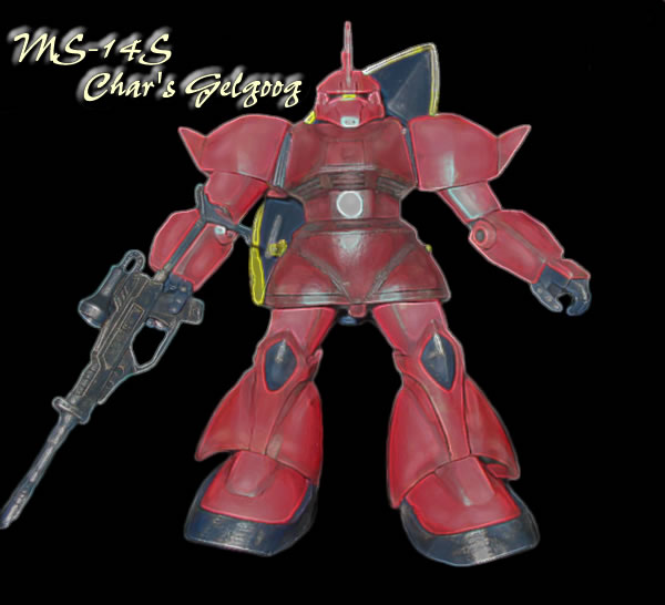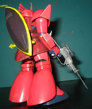 上の画像は、ゲルググの魅力?と勝手に決めております”横顔”をなんとか格好良く表現できないか?と色々試行錯誤した挙句に「偶然」出来た(・・・orz)もので、このコーナーのTOPにも飾っています。 で、ウェザリングも一通り完了。 もちろん、私のやる「ウェザリング」は、筆塗りによる、斑を隠したり誤魔化したりする為に行うのが主目的です(笑