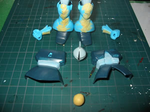 で、現時点での進行状況です。 写真下部に転がっているパテ玉は何か?と言いますと、これまでに無駄になったパテの残りを、丸く重ねてきた記念品です。 そう、一気に作業が行えない構成なので、どうしても必要以上に無駄が生じてしまうのです。 これは塗料も同じ。(時間もね!!)