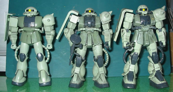 ↑ 左から 【TVシリーズ】:量産型ザク 【FG】:MS-06FザクU 【HG】:MS-06J/FザクU(第08MS小隊) 身長:HG>TV>FGのようですね。顔はFGが小顔です。私はFG派です(笑