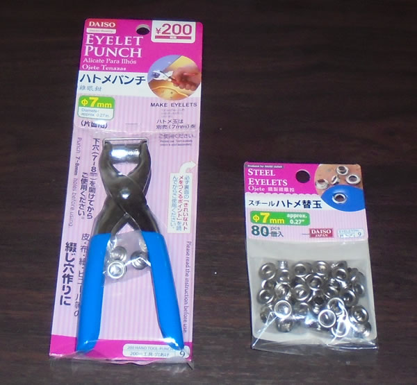 という訳で、手元にある道具と材料 (以前に100均で買った合皮の端切れと、同じく100均のハトメ) でどうにかしてみよう、と考えました。この合皮の端切れとハトメは、全く別の用事で買って持っていたものです。