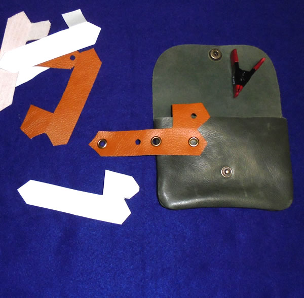 なので、最終的に合皮を二重にして、カラビナを取付ける為にハトメを取付たパーツを、財布全体を挟み込む形で取付る方法を思いつきました。