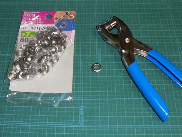 気を取り直して、もう一度切り出して、今度は、100均の物ではなく、ちゃんと手芸店で買って来たハトメセットの物を仮装着してみます。