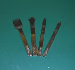 しかし、まぁ専用の道具があれば、なんとかなるのかも?と安易に考えて、まずは針を通す穴を穿つ為の道具=「菱目打ち」をネットで購入。4本セットで1,000円強くらい。