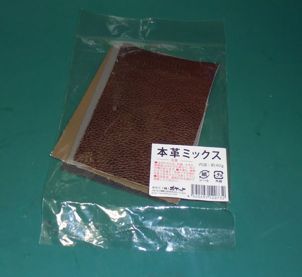 近所の100均で、長辺が10cmくらいの長方形に切られた革の端切れの詰め合わせが売られてました。何の革かは知りませんが、中には牛革っぽいのもあるみたいなので、試しに購入。