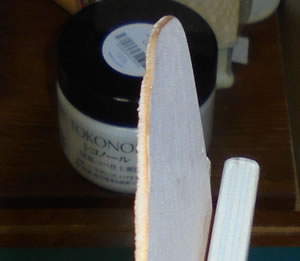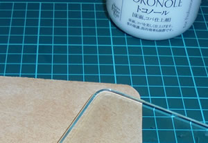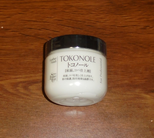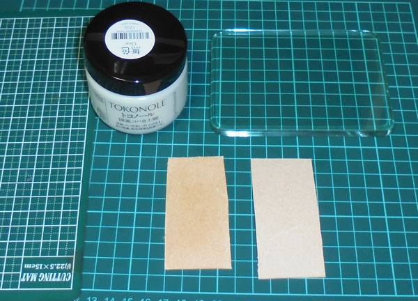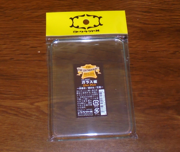 型紙にそって切り抜いたヌメ革ですが、この時点で、床面処理をするのが手順という事で、ネットで調べた結果、もっともメジャーな 「 トコノール 」 と、トコノールを塗り伸ばしたり、床面を磨く為のガラス板を買ってみました。