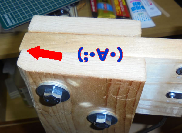余計なチャレンジをした結果、あれだけ太いボルトを、しかも2本も使ってガッチリ固定した筈の板が、3mmもズレてしまうという大事件発生・・・