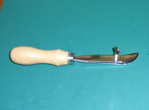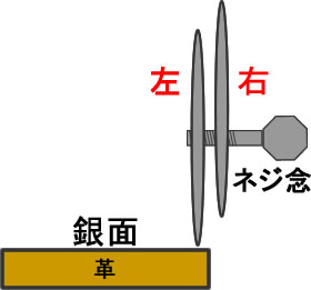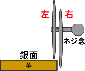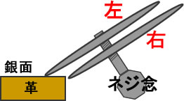 右手でこのネジ念を持ってガイドを引く場合、革の右端に、ネジ念の出っ張った側の刃を引っ掛けて、出っ張って無い側の刃で革にガイドを引くのが通常の使い方だと思うのです。