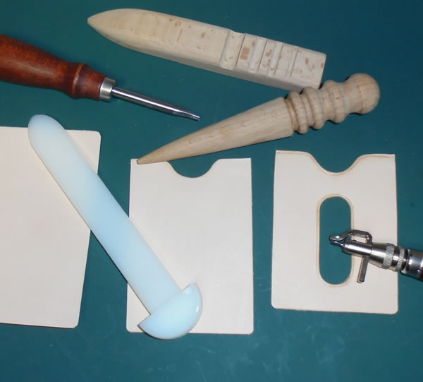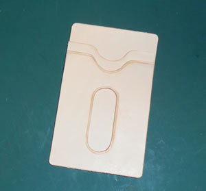 角を丸くする為に、革ポンチを使うので、その中心点に印を付ける為に、各角に変な形の出っ張りを設けてあるのです。
