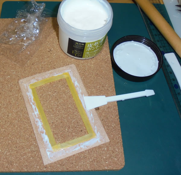 革同士とかの場合だと、本当はもっと接着剤が乾いてからやるべきですが、革と透明セルがどう接着するのか自信が無かったので、まだ乾いてない段階で接着。