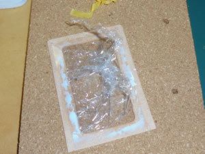 透明セルに接着剤がハミ出すと不細工極まりない事になるので、念の為、接着した際に押し出されるであろう部分に余白を作ってマスキングしてから接着剤を塗ります。