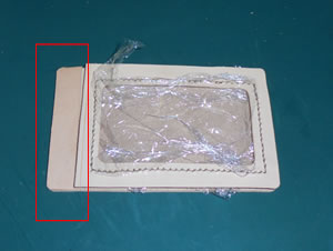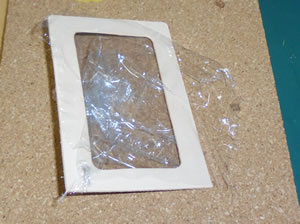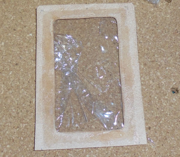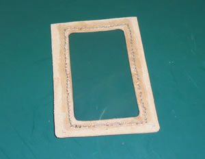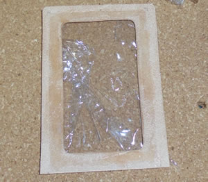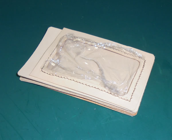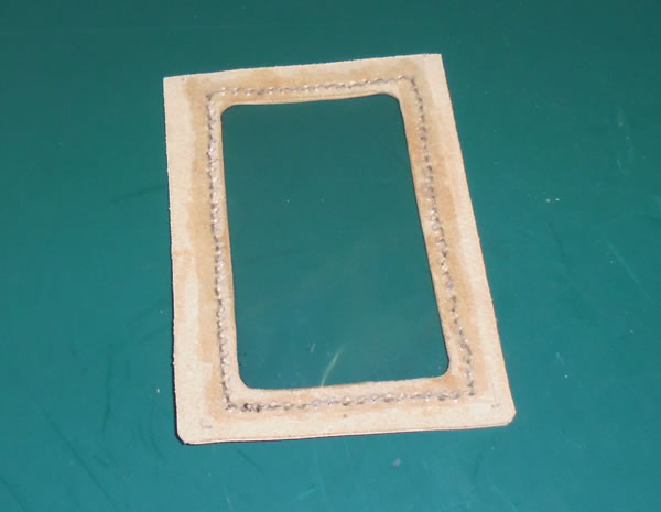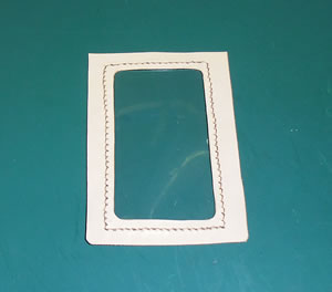 では、「別たち」で真っすぐに切った筈の窓穴の四辺が波打ってた原因ですが、たぶん、接着剤を塗った事に加えて、透明セルを貼ってから、ローラーでしっかり固定させた時に、革が伸びてしまい、たるみが出たんだという結論に達しました。