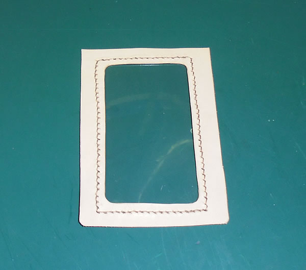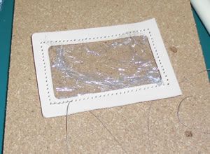 自分の普段使いの、フェイクレザーの安物定期入れを観察した所、透明セルは縫い付けられていたので、特に何も考えずに、私も縫い付ける事にしました。