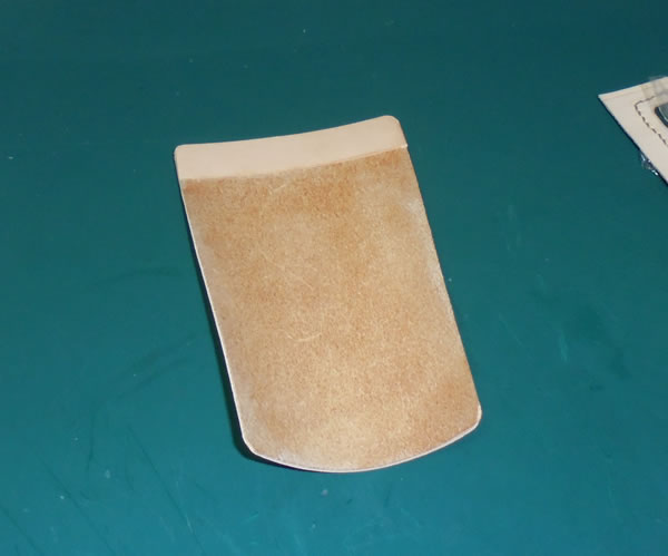 丁度の大きさに調節した革パーツの、ポケットの入り口に面する部分を革スキで薄くしていきます。