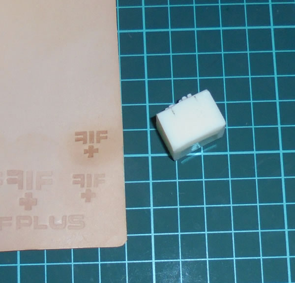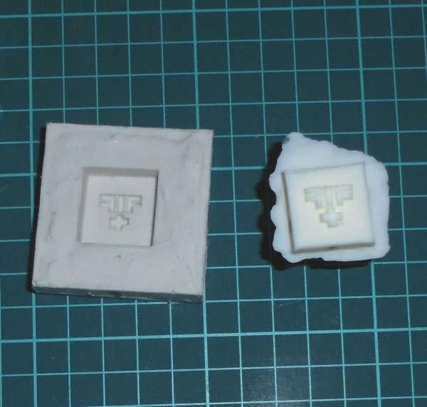 完成した樹脂刻印は、やはり背面側が傾斜している様にみえますが、実はこれもバリで、プラ板に沿って残ってしまったレジンの薄い層が硬化してしまってるだけです。