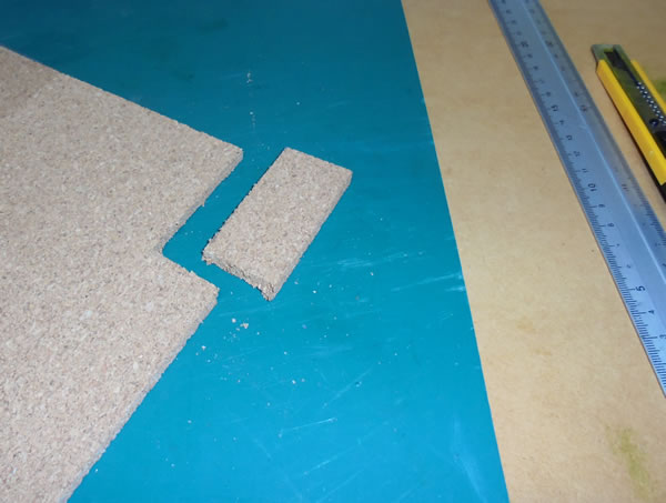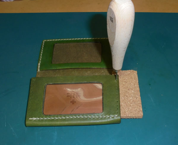 表側に打った菱目穴と、マチ側に貫通させないといけませんが、その際に、1cm以下の隙間にこのコルク板を嵌め込んで下敷きにして、菱ギリで穴を貫通させることにした、という訳です。