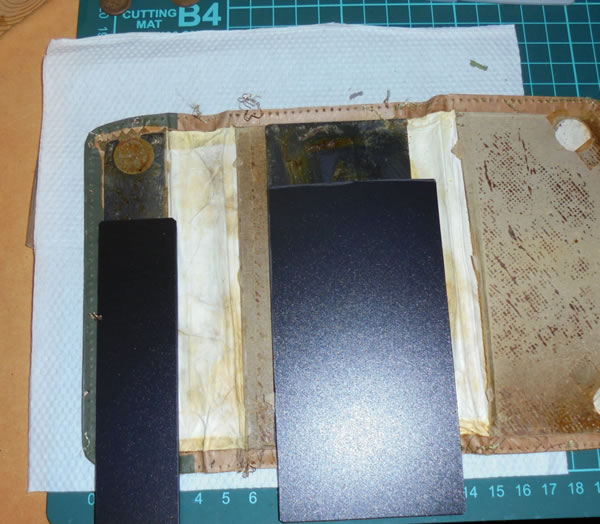 例の白い革と違って、ちゃんと毛羽立ちが収まり艶が出て来たのは良いのですが、そもそも元々の物は、裏地にスウェードっぽい物が貼ってあり、それで中の黒い板パーツを隠していたのです。
