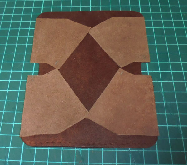 外装パーツと内装パーツを、一時的にしっかり合わせて、ちゃんと同じ位置に菱目穴を開けて置かないと、後で縫い合わせる時にグダグダになっちゃうので、この作業は慎重にやる必要があります。