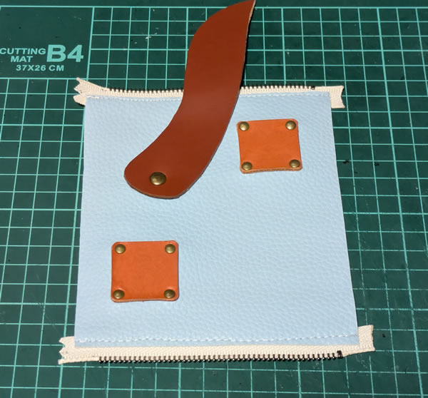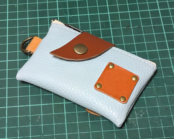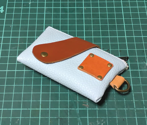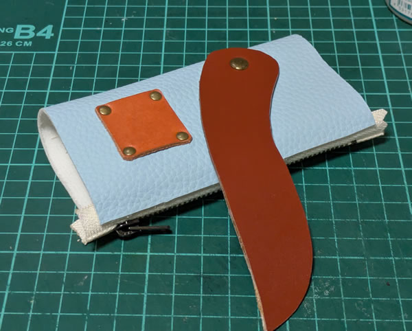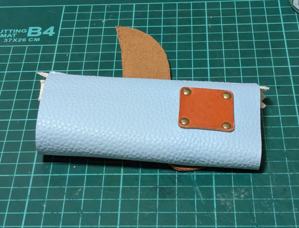 今回使ったフェイクレザーの淡い水色と、革の茶色、橙色、カシメのアンティークゴールドという渋い系の色のミスマッチというか、ギャップが良いかもね?、という評価を家族から頂いたのですが、フェイクレザーの色の評価がメインになってる気がしてちょっと複雑ですw