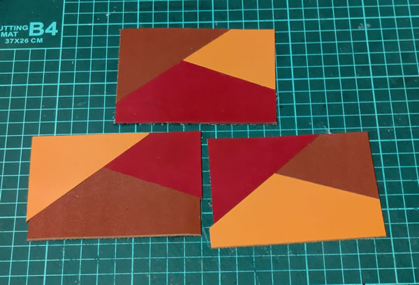 型紙を作って同じサイズ・同じ形に切ったつもりですが、革に引く切り取り線の微妙な違いによって1ミリとか2ミリの単位で大きさが違ってしまうのです。