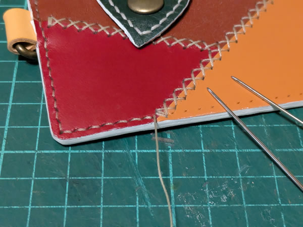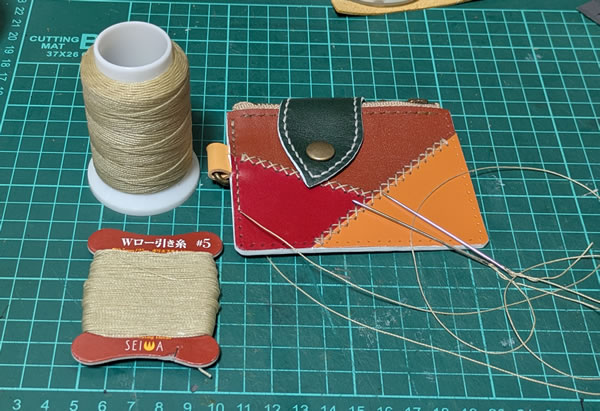 レザークラフトの一般的な縫い方の場合、縫う長さや革の厚みによって前後するものの、縫う長さの約4倍程度の糸を用意することになってます。10cm縫うのに40cmくらいの糸を用意するという事です。