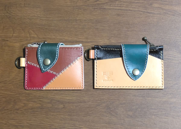 上の写真の右側、現時点で唯一商品として採用してる物は、カードポケットがそれぞれ前後にある上に、ファスナーポケットの中にもカードが入ります。お札も普通の3つ折りで入ります。そういうサイズで作りました。