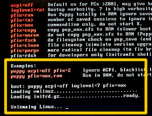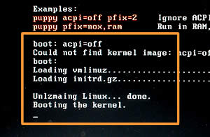 boot: puppy acpi=off loglevel=7 pfix=nox