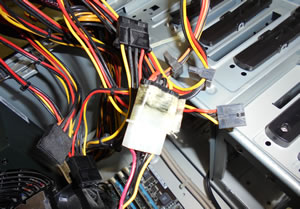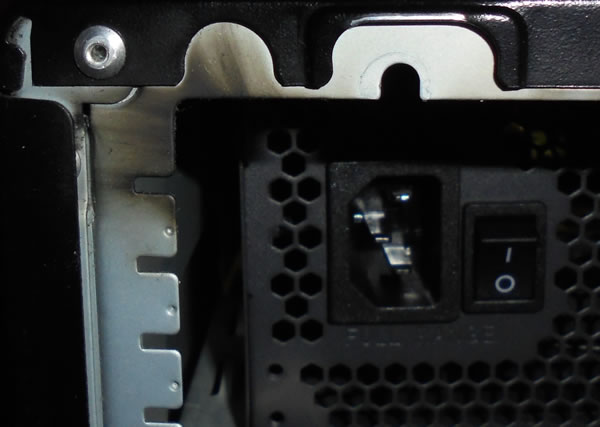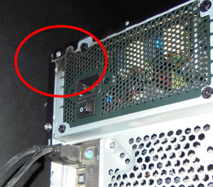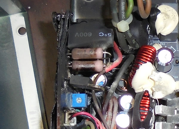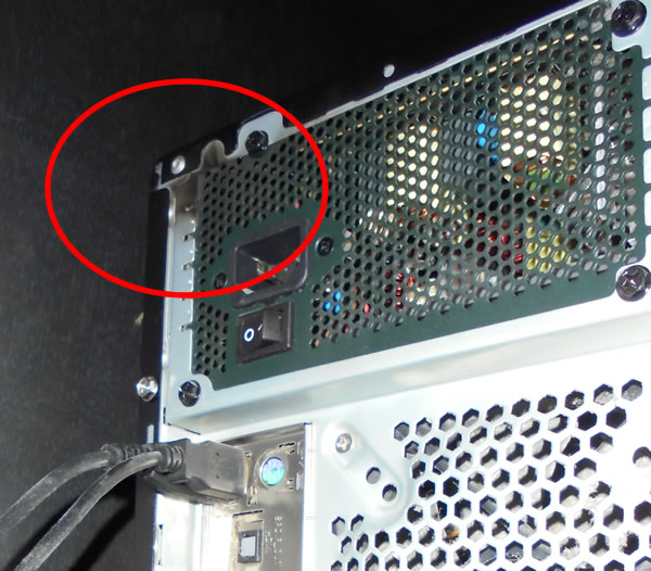 上の写真の様に、ケースの外から焼け跡を見つけたのではなく、異臭の元を探してケースの側面パネルを開け、さらに鼻で匂いを追い掛けた結果、電源ユニットに到達しました。