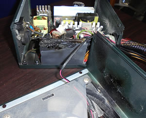 そのまま側面パネルを外し、異臭漂う中、各パーツに鼻をあてて、匂いを嗅ぎ続けると、どうも電源ユニットが一番怪しい、という結論に。